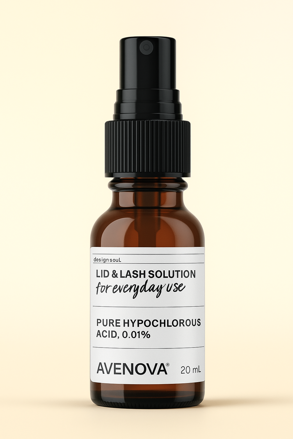 La solución en aerosol hipoclorosa Avenova® contiene ácido hipocloroso puro, una sustancia natural con propiedades antimicrobianas. Está específicamente formulada para limpiar y suavizar los párpados y las pestañas, ayudando a eliminar residuos, exceso de grasa y bacterias que pueden contribuir a la inflamación de los párpados, los síntomas del ojo seco y otros problemas relacionados con los párpados.
